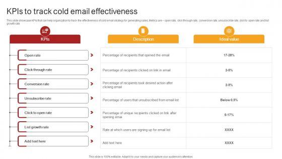 This slide showcase KPIs that can help organization to track the effectiveness of cold email strategy for generating sales. Metrics are open rate, click through rate, conversion rate, unsubscribe rate, click to open rate and list growth rate. Welcome to our selection of the Remote Sales Plan For Kpis To Track Cold Email Effectiveness Strategy SS V. These are designed to help you showcase your creativity and bring your sphere to life. Planning and Innovation are essential for any business that is just starting out. This collection contains the designs that you need for your everyday presentations. All of our PowerPoints are 100Percent editable, so you can customize them to suit your needs. This multi-purpose template can be used in various situations. Grab these presentation templates today. This slide showcase KPIs that can help organization to track the effectiveness of cold email strategy for generating sales. Metrics are open rate, click through rate, conversion rate, unsubscribe rate, click to open rate and list growth rate.