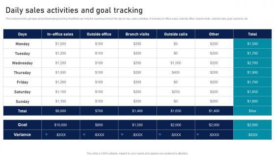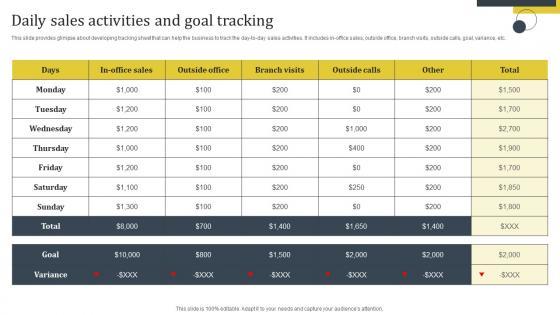 This slide provides glimpse about developing tracking sheet that can help the business to track the day-to-day sales activities. It includes in-office sales, outside office, branch visits, outside calls, goal, variance, etc. If your project calls for a presentation, then Slidegeeks is your go to partner because we have professionally designed, easy to edit templates that are perfect for any presentation. After downloading, you can easily edit Daily Sales Activities And Goal Tracking Developing Extensive Sales And Operations Strategy Elements Pdf and make the changes accordingly. You can rearrange slides or fill them with different images. Check out all the handy templates. This slide provides glimpse about developing tracking sheet that can help the business to track the day-to-day sales activities. It includes in-office sales, outside office, branch visits, outside calls, goal, variance, etc.