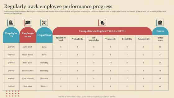 The following slide represents staff progress tracking sheet to monitor individual productivity and gain real time insights. It includes elements such as employee ID, name, department, quality of work, job knowledge, team work, reliability, adaptability etc. If you are looking for a format to display your unique thoughts, then the professionally designed Regularly Track Employee Describing Business Performance Administration Goals Clipart Pdf is the one for you. You can use it as a Google Slides template or a PowerPoint template. Incorporate impressive visuals, symbols, images, and other charts. Modify or reorganize the text boxes as you desire. Experiment with shade schemes and font pairings. Alter, share or cooperate with other people on your work. Download Regularly Track Employee Describing Business Performance Administration Goals Clipart Pdf and find out how to give a successful presentation. Present a perfect display to your team and make your presentation unforgettable. The following slide represents staff progress tracking sheet to monitor individual productivity and gain real time insights. It includes elements such as employee ID, name, department, quality of work, job knowledge, team work, reliability, adaptability etc.