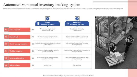 This slide showcases comparison of manual and automated inventory tracking system. It shows comparison on the basis of time required, stock levels, clarity among employees, training and investment required. Are you in need of a template that can accommodate all of your creative concepts This one is crafted professionally and can be altered to fit any style. Use it with Google Slides or PowerPoint. Include striking photographs, symbols, depictions, and other visuals. Fill, move around, or remove text boxes as desired. Test out color palettes and font mixtures. Edit and save your work, or work with colleagues. Download Automated Vs Manual Inventory Tracking System Themes PDF and observe how to make your presentation outstanding. Give an impeccable presentation to your group and make your presentation unforgettable.