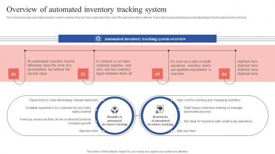 This slide showcases automated inventory system overview that can help organization track stock through automation software. It also showcases advantages and disadvantages of automated inventory tracking. Present like a pro with Overview Of Automated Inventory Tracking System Slides PDF Create beautiful presentations together with your team, using our easy to use presentation slides. Share your ideas in real time and make changes on the fly by downloading our templates. So whether you are in the office, on the go, or in a remote location, you can stay in sync with your team and present your ideas with confidence. With Slidegeeks presentation got a whole lot easier. Grab these presentations today.