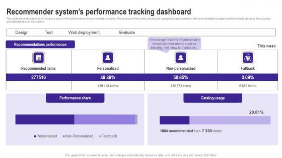 This slide shows the dashboard to keep a track of the performance of recommender systems. The purpose of this slide is to provide a graphical representation of recommendation engines performance to enhance the accuracy and effectiveness of the system. Present like a pro with Recommender Systems Performance Tracking Use Cases Of Filtering Methods Infographics Pdf Create beautiful presentations together with your team, using our easy to use presentation slides. Share your ideas in real time and make changes on the fly by downloading our templates. So whether you are in the office, on the go, or in a remote location, you can stay in sync with your team and present your ideas with confidence. With Slidegeeks presentation got a whole lot easier. Grab these presentations today. This slide shows the dashboard to keep a track of the performance of recommender systems. The purpose of this slide is to provide a graphical representation of recommendation engines performance to enhance the accuracy and effectiveness of the system.