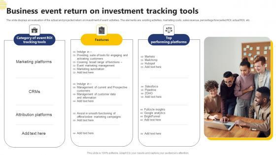 The slide displays an evaluation of the actual and projected return on investment of event activities. The elements are existing activities, marketing costs, sales revenue, percentage forecasted ROI, actual ROI, etc. Showcasing this set of slides titled Business Event Return On Investment Tracking Tools Rules Pdf The topics addressed in these templates are Marketing Platforms, Attribution Platforms, Features All the content presented in this PPT design is completely editable. Download it and make adjustments in color, background, font etc. as per your unique business setting. The slide displays an evaluation of the actual and projected return on investment of event activities. The elements are existing activities, marketing costs, sales revenue, percentage forecasted ROI, actual ROI, etc.