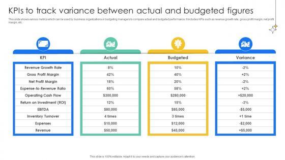 This slide shows various metrics which can be used by business organizations or budgeting managers to compare actual and budgeted performance. It includes KPIs such as revenue growth rate, gross profit margin, net profit margin, etc. Coming up with a presentation necessitates that the majority of the effort goes into the content and the message you intend to convey. The visuals of a PowerPoint presentation can only be effective if it supplements and supports the story that is being told. Keeping this in mind our experts created KPIs To Track Variance Between Actual Effective And Efficient Tools To Develop Fin SS V to reduce the time that goes into designing the presentation. This way, you can concentrate on the message while our designers take care of providing you with the right template for the situation. This slide shows various metrics which can be used by business organizations or budgeting managers to compare actual and budgeted performance. It includes KPIs such as revenue growth rate, gross profit margin, net profit margin, etc.
