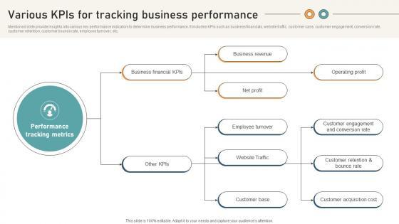 Mentioned slide provide insights into various key performance indicators to determine business performance. It includes KPIs such as business financials, website traffic, customer case, customer engagement, conversion rate, customer retention, customer bounce rate, employee turnover, etc. Make sure to capture your audiences attention in your business displays with our gratis customizable Comprehensive Guide For Website Various Kpis For Tracking Business Performance. These are great for business strategies, office conferences, capital raising or task suggestions. If you desire to acquire more customers for your tech business and ensure they stay satisfied, create your own sales presentation with these plain slides. Mentioned slide provide insights into various key performance indicators to determine business performance. It includes KPIs such as business financials, website traffic, customer case, customer engagement, conversion rate, customer retention, customer bounce rate, employee turnover, etc.