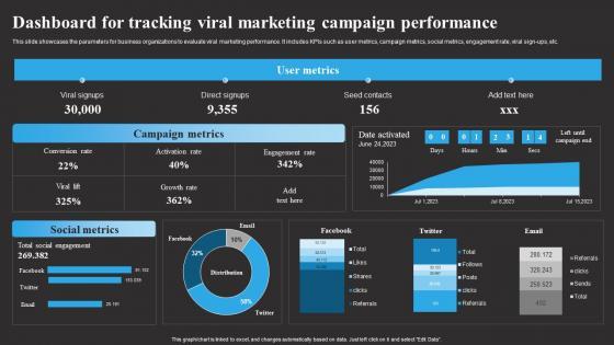 This slide showcases the parameters for business organizations to evaluate viral marketing performance. It includes KPIs such as user metrics, campaign metrics, social metrics, engagement rate, viral sign-ups, etc. Find highly impressive Dashboard For Tracking Viral Marketing Tracking Word Mouth Marketing Inspiration PDF on Slidegeeks to deliver a meaningful presentation. You can save an ample amount of time using these presentation templates. No need to worry to prepare everything from scratch because Slidegeeks experts have already done a huge research and work for you. You need to download Dashboard For Tracking Viral Marketing Tracking Word Mouth Marketing Inspiration PDF for your upcoming presentation. All the presentation templates are 100 percent editable and you can change the color and personalize the content accordingly. Download now This slide showcases the parameters for business organizations to evaluate viral marketing performance. It includes KPIs such as user metrics, campaign metrics, social metrics, engagement rate, viral sign-ups, etc.