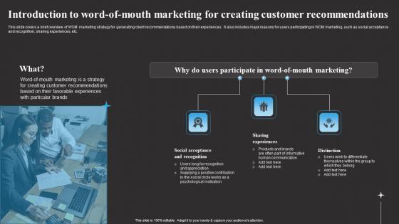 This slide covers a brief overview of WOM marketing strategy for generating client recommendations based on their experiences. It also includes major reasons for users participating in WOM marketing, such as social acceptance and recognition, sharing experiences, etc. Welcome to our selection of the Introduction To Word Of Mouth Marketing For Tracking Word Mouth Marketing Inspiration PDF. These are designed to help you showcase your creativity and bring your sphere to life. Planning and Innovation are essential for any business that is just starting out. This collection contains the designs that you need for your everyday presentations. All of our PowerPoints are 100 percent editable, so you can customize them to suit your needs. This multi-purpose template can be used in various situations. Grab these presentation templates today This slide covers a brief overview of WOM marketing strategy for generating client recommendations based on their experiences. It also includes major reasons for users participating in WOM marketing, such as social acceptance and recognition, sharing experiences, etc.