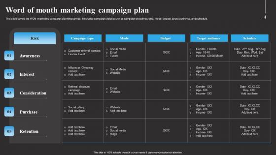 This slide covers the WOM marketing campaign planning canvas. It includes campaign details such as campaign objectives, type, mode, budget, target audience, and schedule. Do you have an important presentation coming up Are you looking for something that will make your presentation stand out from the rest Look no further than Word Of Mouth Marketing Campaign Plan Tracking Word Mouth Marketing Inspiration PDF. With our professional designs, you can trust that your presentation will pop and make delivering it a smooth process. And with Slidegeeks, you can trust that your presentation will be unique and memorable. So why wait Grab Word Of Mouth Marketing Campaign Plan Tracking Word Mouth Marketing Inspiration PDF today and make your presentation stand out from the rest This slide covers the WOM marketing campaign planning canvas. It includes campaign details such as campaign objectives, type, mode, budget, target audience, and schedule.