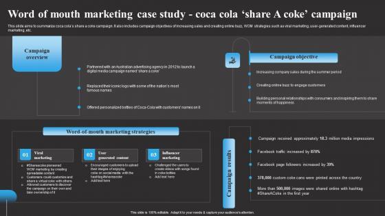 This slide aims to summarize coca colas share a coke campaign. It also includes campaign objectives of increasing sales and creating online buzz, WOM strategies such as viral marketing, user-generated content, influencer marketing, etc. Whether you have daily or monthly meetings, a brilliant presentation is necessary. Word Of Mouth Marketing Case Study Coca Cola Tracking Word Mouth Marketing Guidelines PDF can be your best option for delivering a presentation. Represent everything in detail using Word Of Mouth Marketing Case Study Coca Cola Tracking Word Mouth Marketing Guidelines PDF and make yourself stand out in meetings. The template is versatile and follows a structure that will cater to your requirements. All the templates prepared by Slidegeeks are easy to download and edit. Our research experts have taken care of the corporate themes as well. So, give it a try and see the results. This slide aims to summarize coca colas share a coke campaign. It also includes campaign objectives of increasing sales and creating online buzz, WOM strategies such as viral marketing, user-generated content, influencer marketing, etc.