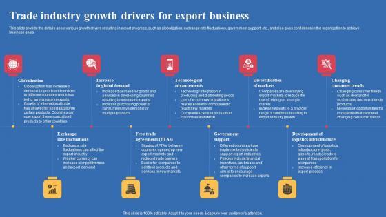 This slide provide the details about various growth drivers resulting in export progress, such as globalization, exchange rate fluctuations, government support, etc. and also gives confidence in the organization to achieve Do you have to make sure that everyone on your team knows about any specific topic I yes, then you should give Trade Industry Growth Drivers For Export Business Export Business Plan Topics Pdf a try. Our experts have put a lot of knowledge and effort into creating this impeccable Trade Industry Growth Drivers For Export Business Export Business Plan Topics Pdf You can use this template for your upcoming presentations, as the slides are perfect to represent even the tiniest detail. You can download these templates from the Slidegeeks website and these are easy to edit. So grab these today. This slide provide the details about various growth drivers resulting in export progress, such as globalization, exchange rate fluctuations, government support, etc. and also gives confidence in the organization to achieve