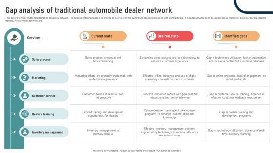 This covers flaws of traditional automobile dealership network. The purpose of this template is to provide an overview on the current and desired state along with identified gaps. It includes services such as sales process, marketing, customer service, dealers training, inventory management, etc. Find highly impressive Ultimate Guide To Developing Gap Analysis Of Traditional Automobile Dealer Network Strategy SS V on Slidegeeks to deliver a meaningful presentation. You can save an ample amount of time using these presentation templates. No need to worry to prepare everything from scratch because Slidegeeks experts have already done a huge research and work for you. You need to download Ultimate Guide To Developing Gap Analysis Of Traditional Automobile Dealer Network Strategy SS V for your upcoming presentation. All the presentation templates are 100 percent editable and you can change the color and personalize the content accordingly. Download now This covers flaws of traditional automobile dealership network. The purpose of this template is to provide an overview on the current and desired state along with identified gaps. It includes services such as sales process, marketing, customer service, dealers training, inventory management, etc.