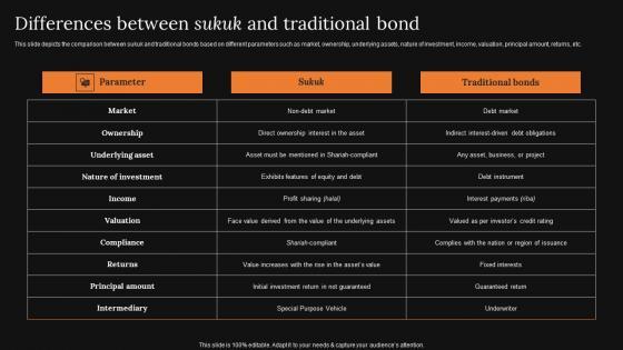This slide depicts the comparison between sukuk and traditional bonds based on different parameters such as market, ownership, underlying assets, nature of investment, income, valuation, principal amount, returns, etc. Get a simple yet stunning designed Differences Between Sukuk And Traditional Bond A Detailed Knowledge Of Islamic Finance Introduction Pdf. It is the best one to establish the tone in your meetings. It is an excellent way to make your presentations highly effective. So, download this PPT today from Slidegeeks and see the positive impacts. Our easy to edit Differences Between Sukuk And Traditional Bond A Detailed Knowledge Of Islamic Finance Introduction Pdf can be your go to option for all upcoming conferences and meetings. So, what are you waiting for Grab this template today. This slide depicts the comparison between sukuk and traditional bonds based on different parameters such as market, ownership, underlying assets, nature of investment, income, valuation, principal amount, returns, etc.