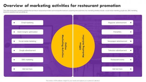 This slide showcases overview of offline marketing that can help in restaurant promotion. It also showcase benefits of offline restaurant marketing and channels for running promotional campaigns. The best PPT templates are a great way to save time, energy, and resources. Slidegeeks have 100 percent editable powerpoint slides making them incredibly versatile. With these quality presentation templates, you can create a captivating and memorable presentation by combining visually appealing slides and effectively communicating your message. Download Digital And Traditional Marketing Methods Overview Of Marketing Activities Restaurant Mockup Pdf from Slidegeeks and deliver a wonderful presentation. This slide showcases overview of offline marketing that can help in restaurant promotion. It also showcase benefits of offline restaurant marketing and channels for running promotional campaigns
