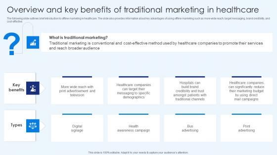 The following slide outlines brief introduction to offline marketing in healthcare. The slide also provides information about key advantages of using offline marketing such as more wide reach, target messaging, brand credibility, and cost-effective. The best PPT templates are a great way to save time, energy, and resources. Slidegeeks have 100 percent editable powerpoint slides making them incredibly versatile. With these quality presentation templates, you can create a captivating and memorable presentation by combining visually appealing slides and effectively communicating your message. Download Overview And Key Benefits Of Traditional Marketing In Healthcare Download PDF from Slidegeeks and deliver a wonderful presentation.