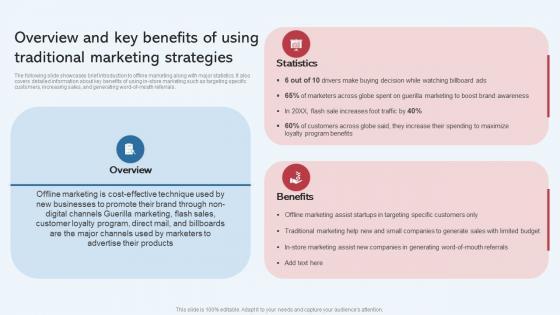 The following slide showcases brief introduction to offline marketing along with major statistics. It also covers detailed information about key benefits of using in-store marketing such as targeting specific customers, increasing sales, and generating word-of-mouth referrals. Do you know about Slidesgeeks Overview And Key Benefits Of Using Overview And Key Benefits Of Using Traditional Marketing Strategies Effective GTM Techniques Themes PDF These are perfect for delivering any kind od presentation. Using it, create PowerPoint presentations that communicate your ideas and engage audiences. Save time and effort by using our pre-designed presentation templates that are perfect for a wide range of topic. Our vast selection of designs covers a range of styles, from creative to business, and are all highly customizable and easy to edit. Download as a PowerPoint template or use them as Google Slides themes. The following slide showcases brief introduction to offline marketing along with major statistics. It also covers detailed information about key benefits of using in-store marketing such as targeting specific customers, increasing sales, and generating word-of-mouth referrals.