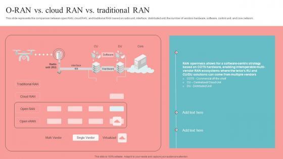 This slide represents the comparison between open RAN, cloud RAN, and traditional RAN based on radio unit, interface, distributed unit, the number of vendors hardware, software, control unit, and core network. Do you know about Slidesgeeks Open Radio Access Network IT O RAN Vs Cloud RAN Vs Traditional RAN Download PDF These are perfect for delivering any kind od presentation. Using it, create PowerPoint presentations that communicate your ideas and engage audiences. Save time and effort by using our pre designed presentation templates that are perfect for a wide range of topic. Our vast selection of designs covers a range of styles, from creative to business, and are all highly customizable and easy to edit. Download as a PowerPoint template or use them as Google Slides themes.