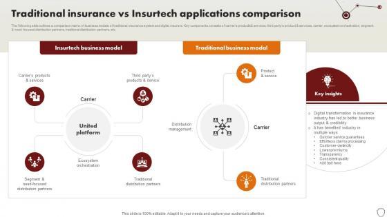The following slide outlines a comparison matrix of business models of traditional insurance system and digital insurers. Key components consists of carriers productsand services, third partys product and services, carrier, ecosystem orchestration, segment and need focused distribution partners, traditional distribution partners, etc. Slidegeeks has constructed Technology Trends In Online Insurance Traditional Insurance Vs Insurtech Applications Comparison after conducting extensive research and examination. These presentation templates are constantly being generated and modified based on user preferences and critiques from editors. Here, you will find the most attractive templates for a range of purposes while taking into account ratings and remarks from users regarding the content. This is an excellent jumping-off point to explore our content and will give new users an insight into our top-notch PowerPoint Templates. The following slide outlines a comparison matrix of business models of traditional insurance system and digital insurers. Key components consists of carriers productsand services, third partys product and services, carrier, ecosystem orchestration, segment and need focused distribution partners, traditional distribution partners, etc.