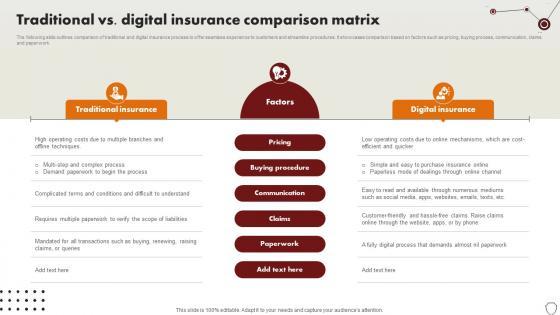 The following slide outlines comparison of traditional and digital insurance process to offer seamless experience to customers and streamline procedures. It showcases comparison based on factors such as pricing, buying process, communication, claims and paperwork. Presenting this PowerPoint presentation, titled Technology Trends In Online Insurance Traditional Vs Digital Insurance Comparison Matrix, with topics curated by our researchers after extensive research. This editable presentation is available for immediate download and provides attractive features when used. Download now and captivate your audience. Presenting this Technology Trends In Online Insurance Traditional Vs Digital Insurance Comparison Matrix. Our researchers have carefully researched and created these slides with all aspects taken into consideration. This is a completely customizable Technology Trends In Online Insurance Traditional Vs Digital Insurance Comparison Matrix that is available for immediate downloading. Download now and make an impact on your audience. Highlight the attractive features available with our PPTs. The following slide outlines comparison of traditional and digital insurance process to offer seamless experience to customers and streamline procedures. It showcases comparison based on factors such as pricing, buying process, communication, claims and paperwork.