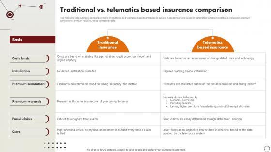 The following slide outlines a comparison matrix of traditional and telematics based car insurance system. Assess insurance based on parameters which are cost basis, installation, premium calculations, premium rewards, fraud claims and costs. Here you can discover an assortment of the finest PowerPoint and Google Slides templates. With these templates, you can create presentations for a variety of purposes while simultaneously providing your audience with an eye-catching visual experience. Download Technology Trends In Online Insurance Traditional Vs Telematics Based Insurance Comparison to deliver an impeccable presentation. These templates will make your job of preparing presentations much quicker, yet still, maintain a high level of quality. Slidegeeks has experienced researchers who prepare these templates and write high-quality content for you. Later on, you can personalize the content by editing the Technology Trends In Online Insurance Traditional Vs Telematics Based Insurance Comparison. The following slide outlines a comparison matrix of traditional and telematics based car insurance system. Assess insurance based on parameters which are cost basis, installation, premium calculations, premium rewards, fraud claims and costs.