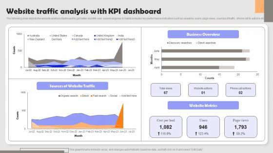 The following slide depicts the website analysis dashboard to get better visibility over search engines. It mainly includes key performance indicators such as sessions, users, page views, sources of traffic, phone call to actions etc. Retrieve professionally designed Website Traffic Analysis With KPI Dashboard Ppt Visual Aids Slides PDF to effectively convey your message and captivate your listeners. Save time by selecting pre made slideshows that are appropriate for various topics, from business to educational purposes. These themes come in many different styles, from creative to corporate, and all of them are easily adjustable and can be edited quickly. Access them as PowerPoint templates or as Google Slides themes. You do not have to go on a hunt for the perfect presentation because Slidegeeks got you covered from everywhere.