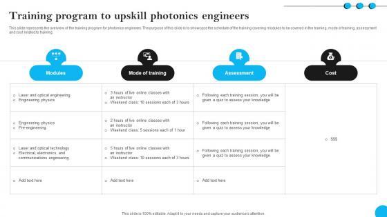 This slide represents the overview of the training program for photonics engineers. The purpose of this slide is to showcase the schedule of the training covering modules to be covered in the training, mode of training, assessment and cost related to training. Crafting an eye-catching presentation has never been more straightforward. Let your presentation shine with this tasteful yet straightforward Fibers IT Training Program To Upskill Photonics Engineers template. It offers a minimalistic and classy look that is great for making a statement. The colors have been employed intelligently to add a bit of playfulness while still remaining professional. Construct the ideal Fibers IT Training Program To Upskill Photonics Engineers that effortlessly grabs the attention of your audience Begin now and be certain to wow your customers This slide represents the overview of the training program for photonics engineers. The purpose of this slide is to showcase the schedule of the training covering modules to be covered in the training, mode of training, assessment and cost related to training.