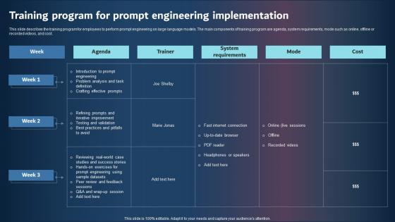 This slide describes the training program for employees to perform prompt engineering on large language models. The main components of training program are agenda, system requirements, mode such as online, offline or recorded videos, and cost. Retrieve professionally designed Training Program For Prompt Engineering Implementation Formats Pdf to effectively convey your message and captivate your listeners. Save time by selecting pre-made slideshows that are appropriate for various topics, from business to educational purposes. These themes come in many different styles, from creative to corporate, and all of them are easily adjustable and can be edited quickly. Access them as PowerPoint templates or as Google Slides themes. You do not have to go on a hunt for the perfect presentation because Slidegeeks got you covered from everywhere. This slide describes the training program for employees to perform prompt engineering on large language models. The main components of training program are agenda, system requirements, mode such as online, offline or recorded videos, and cost.