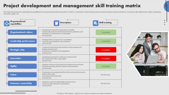 This slide showcases the organizational capabilities for business development and growth in order to improve the overall business environment to achieve desired objectives. It includes skills related to the culture, leadership, innovation, agility, etc. Showcasing this set of slides titled Project Development And Management Skill Training Matrix Demonstration Pdf. The topics addressed in these templates are Organizational Culture, Leadership Performance, Strategic Unity. All the content presented in this PPT design is completely editable. Download it and make adjustments in color, background, font etc. as per your unique business setting. This slide showcases the organizational capabilities for business development and growth in order to improve the overall business environment to achieve desired objectives. It includes skills related to the culture, leadership, innovation, agility, etc.