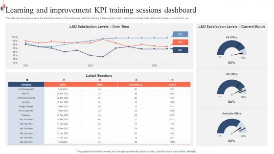 This slide provides glimpse about the satisfaction levels of the employees that took Learning and Development L and D trainings. It includes L and D satisfaction levels current month, etc. Showcasing this set of slides titled Learning And Improvement KPI Training Sessions Dashboard Mockup Pdf. The topics addressed in these templates are Learning And Improvement KPI, Training Sessions Dashboard, Learning And Development. All the content presented in this PPT design is completely editable. Download it and make adjustments in color, background, font etc. as per your unique business setting. This slide provides glimpse about the satisfaction levels of the employees that took Learning and Development L and D trainings. It includes L and D satisfaction levels current month, etc.