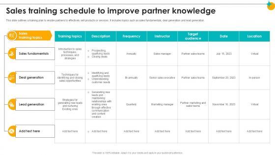 This slide outlines a training plan to enable partners to effectively sell products or services. It includes topics such as sales fundamentals, deal generation and lead generation. Present like a pro with Sales Training Schedule To Improve Partner Knowledge Partner Relationship Ppt Template. Create beautiful presentations together with your team, using our easy-to-use presentation slides. Share your ideas in real-time and make changes on the fly by downloading our templates. So whether you are in the office, on the go, or in a remote location, you can stay in sync with your team and present your ideas with confidence. With Slidegeeks presentation got a whole lot easier. Grab these presentations today. This slide outlines a training plan to enable partners to effectively sell products or services. It includes topics such as sales fundamentals, deal generation and lead generation.