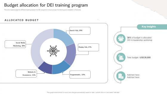 This showcase budget for different training session for DEI program to ensure proper functioning and completion of lectures. Slidegeeks is one of the best resources for PowerPoint templates. You can download easily and regulate Inclusive Workplace Training Program Budget Allocation For Dei Training Program DTE SS V for your personal presentations from our wonderful collection. A few clicks is all it takes to discover and get the most relevant and appropriate templates. Use our Templates to add a unique zing and appeal to your presentation and meetings. All the slides are easy to edit and you can use them even for advertisement purposes. This showcase budget for different training session for DEI program to ensure proper functioning and completion of lectures.