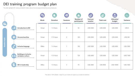 This slide highlights DEI training schedule to foster culture of awareness and inclusivity among employees. From laying roadmaps to briefing everything in detail, our templates are perfect for you. You can set the stage with your presentation slides. All you have to do is download these easy-to-edit and customizable templates. Inclusive Workplace Training Program Dei Training Program Budget Plan DTE SS V will help you deliver an outstanding performance that everyone would remember and praise you for. Do download this presentation today. This slide highlights DEI training schedule to foster culture of awareness and inclusivity among employees.