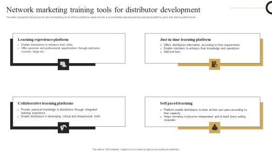 This slide represents training tools for network marketing for an effective distributor sales network. It covers details regarding learning experience platform, just in time learning platforms etc. Retrieve professionally designed Network Marketing Training Strategic Plan Develop Multi Level Marketing Slides Pdf to effectively convey your message and captivate your listeners. Save time by selecting pre made slideshows that are appropriate for various topics, from business to educational purposes. These themes come in many different styles, from creative to corporate, and all of them are easily adjustable and can be edited quickly. Access them as PowerPoint templates or as Google Slides themes. You do not have to go on a hunt for the perfect presentation because Slidegeeks got you covered from everywhere. This slide represents training tools for network marketing for an effective distributor sales network. It covers details regarding learning experience platform, just in time learning platforms etc.