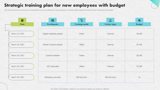 This slide employee training program of organization to increase efficiency of new employees. It includes dates, participants, training mode, training type and budget. Here you can discover an assortment of the finest PowerPoint and Google Slides templates. With these templates, you can create presentations for a variety of purposes while simultaneously providing your audience with an eye catching visual experience. Download Strategic Training Plan New Developing An Impactful SEO Marketing Plan Rules Pdf to deliver an impeccable presentation. These templates will make your job of preparing presentations much quicker, yet still, maintain a high level of quality. Slidegeeks has experienced researchers who prepare these templates and write high quality content for you. Later on, you can personalize the content by editing the Strategic Training Plan New Developing An Impactful SEO Marketing Plan Rules Pdf. This slide employee training program of organization to increase efficiency of new employees. It includes dates, participants, training mode, training type and budget.