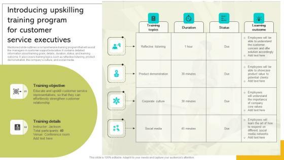 Mentioned slide outlines a comprehensive training program that will assist the managers in customer support education. It contains detailed information about training goals, details, duration, status, and learning outcome. It also covers training topics such as reflective listening, product demonstration, the companys culture, and social media. This Implementing Strategies To Enhance Introducing Upskilling Training Program For Customer Rules PDF is perfect for any presentation, be it in front of clients or colleagues. It is a versatile and stylish solution for organizing your meetings. The Implementing Strategies To Enhance Introducing Upskilling Training Program For Customer Rules PDF features a modern design for your presentation meetings. The adjustable and customizable slides provide unlimited possibilities for acing up your presentation. Slidegeeks has done all the homework before launching the product for you. So, do not wait, grab the presentation templates today Mentioned slide outlines a comprehensive training program that will assist the managers in customer support education. It contains detailed information about training goals, details, duration, status, and learning outcome. It also covers training topics such as reflective listening, product demonstration, the companys culture, and social media.