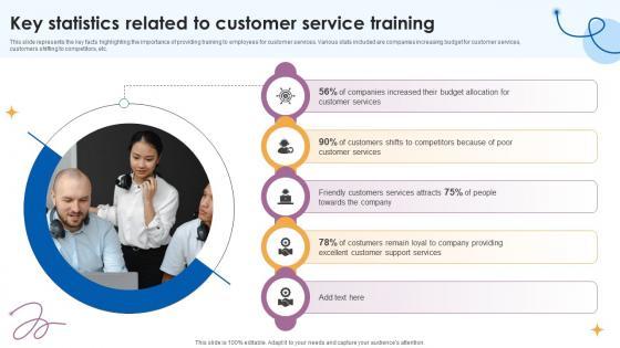 This slide represents the key facts highlighting the importance of providing training to employees for customer services. Various stats included are companies increasing budget for customer services, customers shifting to competitors, etc. This Key Statistics Related To Customer Service Training Customer Service Training Ppt Sample is perfect for any presentation, be it in front of clients or colleagues. It is a versatile and stylish solution for organizing your meetings. The Key Statistics Related To Customer Service Training Customer Service Training Ppt Sample features a modern design for your presentation meetings. The adjustable and customizable slides provide unlimited possibilities for acing up your presentation. Slidegeeks has done all the homework before launching the product for you. So, do not wait, grab the presentation templates today This slide represents the key facts highlighting the importance of providing training to employees for customer services. Various stats included are companies increasing budget for customer services, customers shifting to competitors, etc.