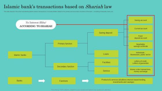 This slide depicts a flowchart representing Islamic banks transactions. It includes details related to the primary and secondary functions of the bank , consisting of deposits, loans, etc. Slidegeeks is one of the best resources for PowerPoint templates. You can download easily and regulate Islamic Banks Transactions Based On Shariah Law Comprehensive Guide To Islamic Ideas Pdf for your personal presentations from our wonderful collection. A few clicks is all it takes to discover and get the most relevant and appropriate templates. Use our Templates to add a unique zing and appeal to your presentation and meetings. All the slides are easy to edit and you can use them even for advertisement purposes. This slide depicts a flowchart representing Islamic banks transactions. It includes details related to the primary and secondary functions of the bank , consisting of deposits, loans, etc.
