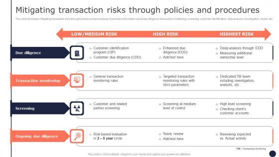 This slide illustrates mitigating transaction risks through policies and procedures. It provides information about due diligence, transaction monitoring, screening, customer identification, data analysis, investigation, review, etc. Retrieve professionally designed Mitigating Transaction Risks Through Policies Mitigating Corporate Scams And Robberies Guidelines Pdf to effectively convey your message and captivate your listeners. Save time by selecting pre-made slideshows that are appropriate for various topics, from business to educational purposes. These themes come in many different styles, from creative to corporate, and all of them are easily adjustable and can be edited quickly. Access them as PowerPoint templates or as Google Slides themes. You do not have to go on a hunt for the perfect presentation because Slidegeeks got you covered from everywhere. This slide illustrates mitigating transaction risks through policies and procedures. It provides information about due diligence, transaction monitoring, screening, customer identification, data analysis, investigation, review, etc.