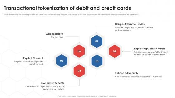 This slide describes the tokenizing of debit and credit cards for transactional purposes. The purpose of this slide is to showcase the transactional tokenization of debit and credit cards. Find a pre-designed and impeccable Transactional Tokenization Of Debit And Credit Cards PPT Presentation. The templates can ace your presentation without additional effort. You can download these easy-to-edit presentation templates to make your presentation stand out from others. So, what are you waiting for Download the template from Slidegeeks today and give a unique touch to your presentation. This slide describes the tokenizing of debit and credit cards for transactional purposes. The purpose of this slide is to showcase the transactional tokenization of debit and credit cards.