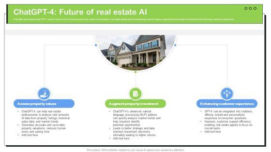This slide showcases Chat GPT-4 as the future tool for enhancing key use cases of real estate. It provides details about assessing property values, augmenting real estate investment and enhancing customer experience. Slidegeeks is here to make your presentations a breeze with Transforming Real Estate ChatGPT 4 Future Of Real Estate AI ChatGPT SS V With our easy-to-use and customizable templates, you can focus on delivering your ideas rather than worrying about formatting. With a variety of designs to choose from, you are sure to find one that suits your needs. And with animations and unique photos, illustrations, and fonts, you can make your presentation pop. So whether you are giving a sales pitch or presenting to the board, make sure to check out Slidegeeks first This slide showcases Chat GPT-4 as the future tool for enhancing key use cases of real estate. It provides details about assessing property values, augmenting real estate investment and enhancing customer experience.