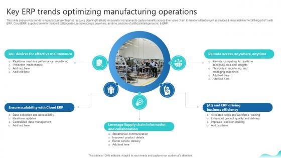 This slide analysis key trends in manufacturing enterprise resource planning that help innovate for companies to capture benefits across their value chain. It mentions trends such as devices and industrial internet of things IIoT with ERP, Cloud ERP, supply chain information and collaboration, remote access, anywhere, anytime, and role of artificial intelligence AI and ERP.If your project calls for a presentation, then Slidegeeks is your go-to partner because we have professionally designed, easy-to-edit templates that are perfect for any presentation. After downloading, you can easily edit Key Erp Trends Optimizing Manufacturing Operations Erp And Digital Transformation For Maximizing DT SS V and make the changes accordingly. You can rearrange slides or fill them with different images. Check out all the handy templates This slide analysis key trends in manufacturing enterprise resource planning that help innovate for companies to capture benefits across their value chain. It mentions trends such as devices and industrial internet of things IIoT with ERP, Cloud ERP, supply chain information and collaboration, remote access, anywhere, anytime, and role of artificial intelligence AI and ERP.