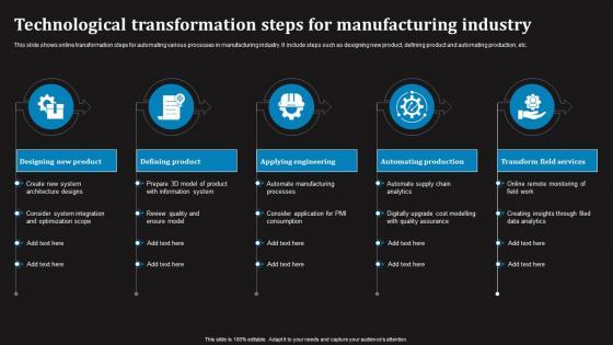 This slide shows online transformation steps for automating various processes in manufacturing industry. It include steps such as designing new product, defining product and automating production, etc. Showcasing this set of slides titled Technological Transformation Steps For Manufacturing Industry Designs Pdf The topics addressed in these templates are Designing New Product, Applying Engineering All the content presented in this PPT design is completely editable. Download it and make adjustments in color, background, font etc. as per your unique business setting. This slide shows online transformation steps for automating various processes in manufacturing industry. It include steps such as designing new product, defining product and automating production, etc.