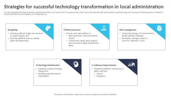 This slide highlights techniques for effective digital transformation in local government. The purpose of this slide is to provide authorities with opportunities for careful planning and ensuring commitment towards communities. It includes elements such as budgeting, risk management, etc. Pitch your topic with ease and precision using this Strategies For Successful Technology Transformation In Local Administration Sample pdf. This layout presents information on Budgeting, Efficient Processes, Risk Management. It is also available for immediate download and adjustment. So, changes can be made in the color, design, graphics or any other component to create a unique layout. This slide highlights techniques for effective digital transformation in local government. The purpose of this slide is to provide authorities with opportunities for careful planning and ensuring commitment towards communities. It includes elements such as budgeting, risk management, etc.
