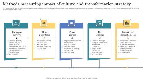The following slide outlines methods to measure company culture aimed to identify quality for making improvements and enhance employee productivity. It covers employee surveys, third party tools, focus groups, exit surveys and behavioural observation scale Showcasing this set of slides titled Methods Measuring Impact Of Culture And Transformation Strategy Microsoft Pdf. The topics addressed in these templates are Employee Surveys, Party Tools, Focus Groups . All the content presented in this PPT design is completely editable. Download it and make adjustments in color, background, font etc. as per your unique business setting. The following slide outlines methods to measure company culture aimed to identify quality for making improvements and enhance employee productivity. It covers employee surveys, third party tools, focus groups, exit surveys and behavioural observation scale