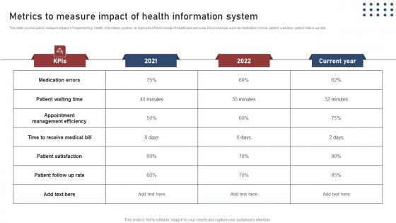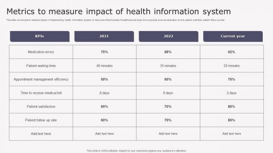 This slide covers kpis to measure impact of implementing health information system to improves effectiveness of healthcare services. It involves kpis such as medication errors, patient wait time, patient follow up rate. Retrieve professionally designed Metrics To Measure Impact Transforming Medicare Services Using Health Structure Pdf to effectively convey your message and captivate your listeners. Save time by selecting pre made slideshows that are appropriate for various topics, from business to educational purposes. These themes come in many different styles, from creative to corporate, and all of them are easily adjustable and can be edited quickly. Access them as PowerPoint templates or as Google Slides themes. You do not have to go on a hunt for the perfect presentation because Slidegeeks got you covered from everywhere. This slide covers kpis to measure impact of implementing health information system to improves effectiveness of healthcare services. It involves kpis such as medication errors, patient wait time, patient follow up rate.