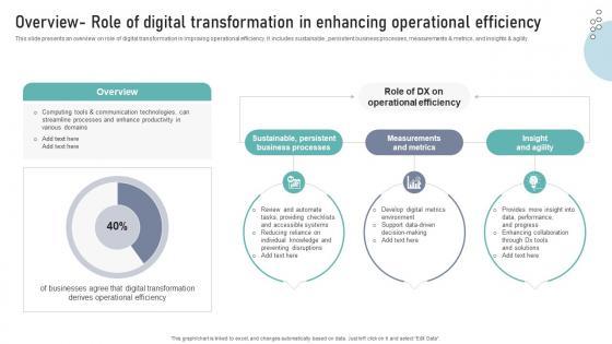 This slide presents an overview on role of digital transformation in improving operational efficiency. It includes sustainable , persistent business processes, measurements and metrics, and insights and agility.This Overview Role Of Digital Transformation In Enhancing Operational Efficiency DT SS V is perfect for any presentation, be it in front of clients or colleagues. It is a versatile and stylish solution for organizing your meetings. The Overview Role Of Digital Transformation In Enhancing Operational Efficiency DT SS V features a modern design for your presentation meetings. The adjustable and customizable slides provide unlimited possibilities for acing up your presentation. Slidegeeks has done all the homework before launching the product for you. So, do not wait, grab the presentation templates today This slide presents an overview on role of digital transformation in improving operational efficiency. It includes sustainable , persistent business processes, measurements and metrics, and insights and agility.
