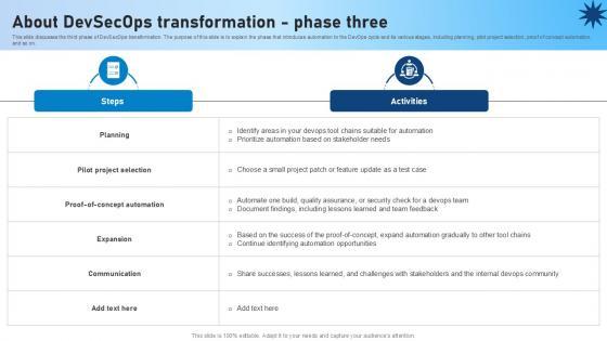 This slide discusses the third phase of DevSecOps transformation. The purpose of this slide is to explain the phase that introduces automation to the DevOps cycle and its various stages, including planning, pilot project selection, proof of concept automation, and so on. Here you can discover an assortment of the finest PowerPoint and Google Slides templates. With these templates, you can create presentations for a variety of purposes while simultaneously providing your audience with an eye-catching visual experience. Download About Devsecops Transformation Phase Three Role Of Devsecops Ppt Powerpoint to deliver an impeccable presentation. These templates will make your job of preparing presentations much quicker, yet still, maintain a high level of quality. Slidegeeks has experienced researchers who prepare these templates and write high-quality content for you. Later on, you can personalize the content by editing the About Devsecops Transformation Phase Three Role Of Devsecops Ppt Powerpoint This slide discusses the third phase of DevSecOps transformation. The purpose of this slide is to explain the phase that introduces automation to the DevOps cycle and its various stages, including planning, pilot project selection, proof of concept automation, and so on.