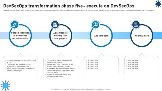 This slide discusses the fifth phase of DevSecOps transformation. The purpose of this slide is to explain the phase executed on DevSecOps, including phased execution in DevSecOps transformation and the advantages of starting with the new project. This modern and well-arranged Devsecops Transformation Phase Five Execute On Devsecops Role Of Devsecops Ppt Slide provides lots of creative possibilities. It is very simple to customize and edit with the Powerpoint Software. Just drag and drop your pictures into the shapes. All facets of this template can be edited with Powerpoint, no extra software is necessary. Add your own material, put your images in the places assigned for them, adjust the colors, and then you can show your slides to the world, with an animated slide included. This slide discusses the fifth phase of DevSecOps transformation. The purpose of this slide is to explain the phase executed on DevSecOps, including phased execution in DevSecOps transformation and the advantages of starting with the new project.