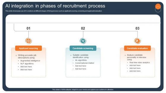 This slide showcases use of AI solutions at different stages of hiring process such as applicant sourcing, screening and applicant evaluation. Do you have to make sure that everyone on your team knows about any specific topic I yes, then you should give Transforming Recruitment Process AI Integration In Phases Of Recruitment Process CRP DK SS a try. Our experts have put a lot of knowledge and effort into creating this impeccable Transforming Recruitment Process AI Integration In Phases Of Recruitment Process CRP DK SS. You can use this template for your upcoming presentations, as the slides are perfect to represent even the tiniest detail. You can download these templates from the Slidegeeks website and these are easy to edit. So grab these today This slide showcases use of AI solutions at different stages of hiring process such as applicant sourcing, screening and applicant evaluation.