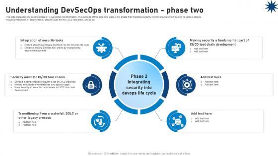 This slide discusses the second phase of DevSecOps transformation. The purpose of this slide is to explain the phase that integrates security into the DevOps lifecycle and its various stages, including integration of security tools, security audit for the CICD tool chain, and so on. If your project calls for a presentation, then Slidegeeks is your go-to partner because we have professionally designed, easy-to-edit templates that are perfect for any presentation. After downloading, you can easily edit Understanding Devsecops Transformation Phase Two Role Of Devsecops Ppt Powerpoint and make the changes accordingly. You can rearrange slides or fill them with different images. Check out all the handy templates This slide discusses the second phase of DevSecOps transformation. The purpose of this slide is to explain the phase that integrates security into the DevOps lifecycle and its various stages, including integration of security tools, security audit for the CICD tool chain, and so on.