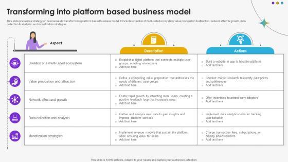 This slide presents a strategy for businesses to transform into platform based business model. It includes creation of multi-sided ecosystem, value proposition and attraction, network effect and growth, data collection and analysis, and monetization strategies.Whether you have daily or monthly meetings, a brilliant presentation is necessary. Transforming Into Platform Based Business Model DT SS V can be your best option for delivering a presentation. Represent everything in detail using Transforming Into Platform Based Business Model DT SS V and make yourself stand out in meetings. The template is versatile and follows a structure that will cater to your requirements. All the templates prepared by Slidegeeks are easy to download and edit. Our research experts have taken care of the corporate themes as well. So, give it a try and see the results. This slide presents a strategy for businesses to transform into platform based business model. It includes creation of multi-sided ecosystem, value proposition and attraction, network effect and growth, data collection and analysis, and monetization strategies.